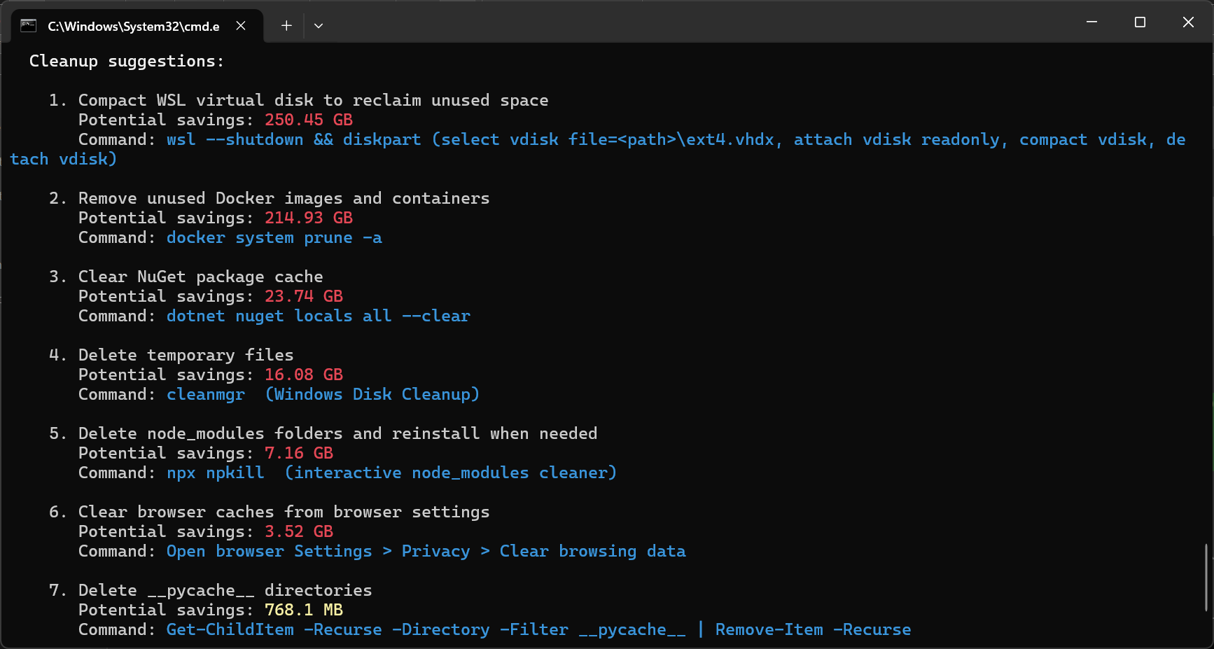 node_modules,bin/obj,.git, browser caches, Docker data, Python venvs, and more - Cleanup suggestions with estimated savings